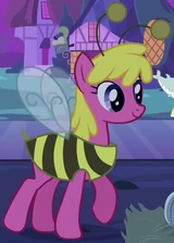 For Nightmare Night in Luna Eclipsed, she is dressed as a bumblebee. Her first spoken line is in this episode, explaining the spider-throwing game to Princess Luna. Her hair, with the bumblebee antennae of her Nightmare Night costume, is seen as a wig in One Bad Apple, during the Babs Seed song. In The Mysterious Mare Do Well, she plummets toward the ground in a ruptured Twinkling Balloon while wearing a pair of pilot's goggles. She gets whisked out of the balloon by the masked pony later dubbed the Mysterious Mare Do Well. Later in the episode, she apologizes after a flower pot drops from her window and almost hits Rainbow Dash. She has another line in The Super Speedy Cider Squeezy 6000 as one of Flim and Flam's customers, complaining about the taste of their cider.
