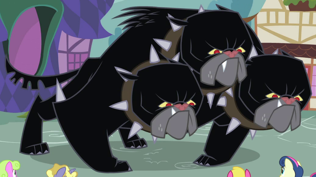 Cerberus is a giant three-headed dog that first appears in It's About Time. According to Twilight, Cerberus is responsible for guarding the gates of Tartarus and that, with Cerberus away from Tartarus, the "ancient evil creatures" imprisoned there could escape and destroy Equestria.
