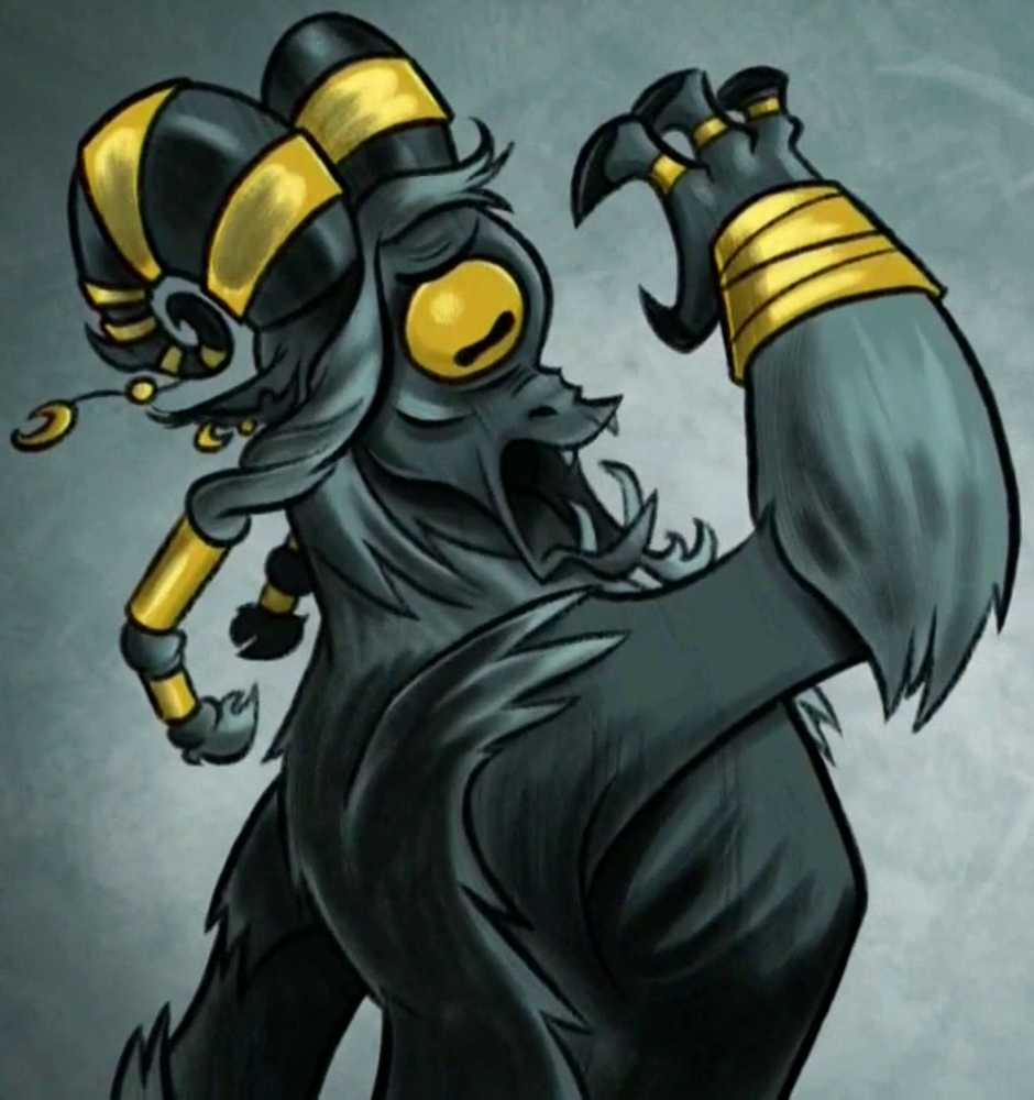 Ahuizotl is a dog-like creature from the book Daring Do and the Quest for the Sapphire Stone who first appears in the episode Read It and Weep. He is Daring Do's archenemy in her quest to retrieve the sapphire stone. He has an elongated dog-like head, with eyes positioned over his nose at the end of his snout. He walks on all fours, with dog-like hind limbs and ape-like forelimbs, and a long monkey-like tail with a hand on its end. Ahuizotl has a tuxedo-style coat, having dark blue fur over most of his body, while his stomach, jaws and hands are of a lighter blue. Ahuizotl wears golden colored jewelry, such as a necklace, a single ear ring, and three bracelets, one for each foreleg, and one around his tail's wrist. He is voiced by Brian Drummond.[1]