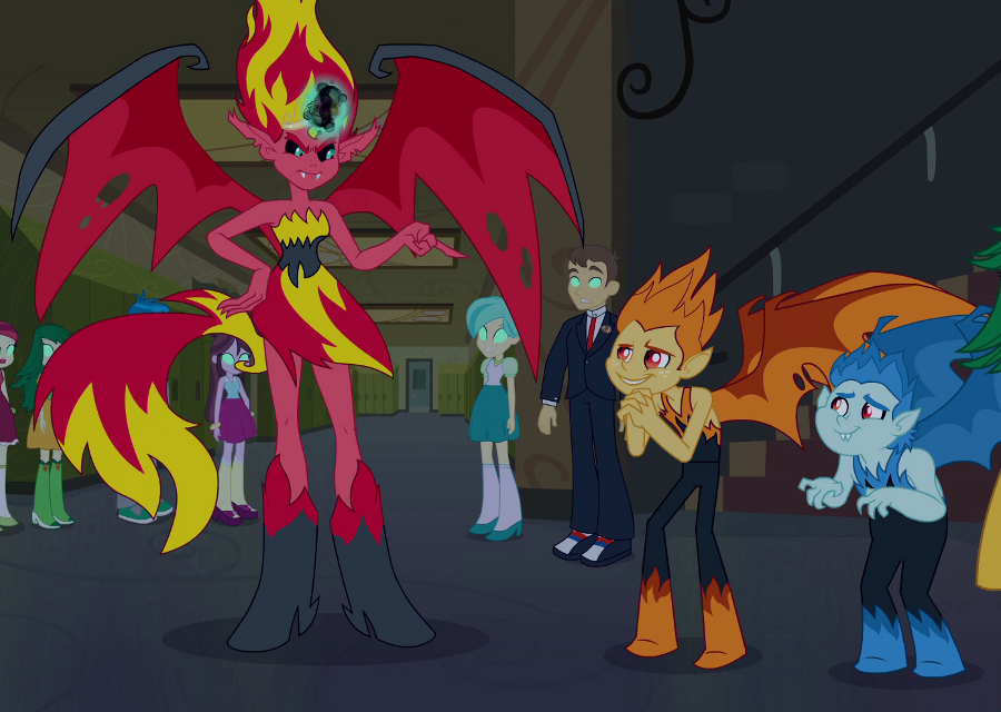 My Little Pony: The Movie: The Junior Novel describes the Storm Creatures as being "...yeti-like..." when they attack Canterlot. - In My Little Pony Equestria Girls: Friendship Games, Sci-Twi's amulet accidentally opens a portal to Equestria, causing a giant plant-like monster to attack the motocross track.