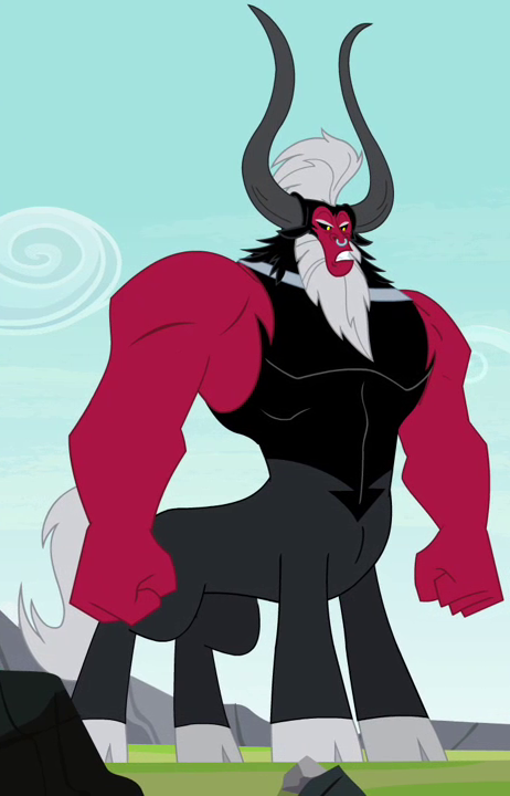 A centaur called Lord Tirek first appears in Twilight's Kingdom - Part 1. He possesses a humanoid upper body with reddish skin, grey hair, a black coat covering his torso, black eyes with yellow pupils, and a lower body and horns resembling that of a black bull.