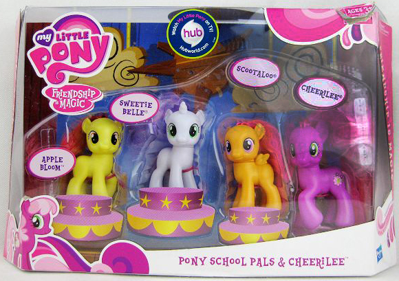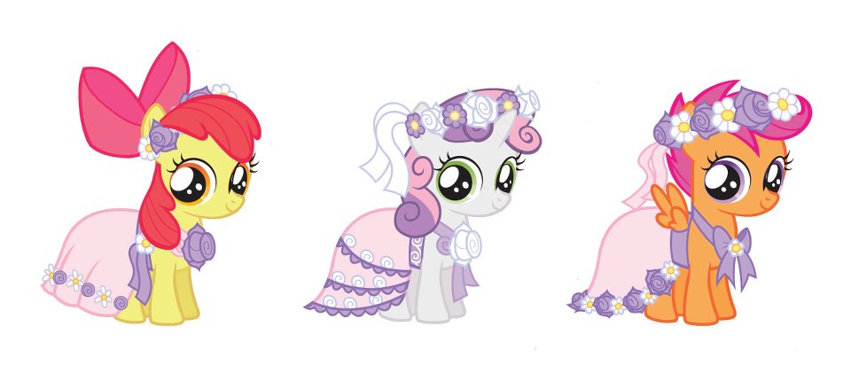 Two toy sets focus on the three Cutie Mark Crusaders. The set Pony School Pals & Cheerilee features them and Cheerilee similarly to The Show Stoppers, with the description "Apple Bloom, Sweetie Belle and Scootaloo really want to earn their cutie marks, and they're not afraid of getting on stage to perform at the school talent show! Their teacher, Cheerilee, is there to cheer them on!" The Pony Wedding set Wedding Flower Fillies features them similarly to their appearance in A Canterlot Wedding - Part 2, with the description "Sweetie Belle, Apple Bloom and Scootaloo have never been to a wedding before. They can’t wait to dress up and wear flowers in their hair!"