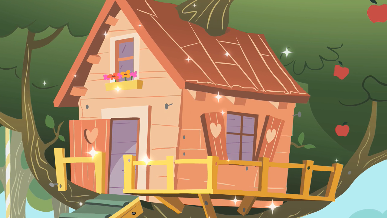 The Cutie Mark Crusaders' clubhouse, formerly owned by Applejack, is located in a "secluded, private part" of Sweet Apple Acres. Since its first appearance in The Show Stoppers, the clubhouse has been seen in many episodes and used for different purposes, with furniture and equipment being added to suit the Crusaders' needs. It has a wide open space, large enough to practice dance moves in (The Show Stoppers), fit several ponies (The Mysterious Mare Do Well), and create large arts and crafts (Hearts and Hooves Day). It has multiple floors, joined by a staircase, and in some episodes an additional building higher up in its tree, connected via an outside ramp. While normally only occupied by the Crusaders, Scootaloo has previously used it to host the "Rainbow Dash Fan Club" in The Mysterious Mare Do Well, and in One Bad Apple, it is briefly occupied by Diamond Tiara, Silver Spoon, and Babs Seed but is reclaimed by the end of the episode. Things seen and used in the clubhouse are: