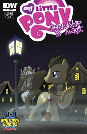 Time Turner appears on My Little Pony: Friendship is Magic Issue #1 page 3. He is featured on the issue's Detroit comic book stores exclusive cover RE. On the issue's Lone Star Comics-exclusive cover RE, he is featured on the cover of a magazine titled Hoof Beat, showing him with a caption beginning "Time-Turner[sic] answers YOUR questio..." and a speech balloon containing the word "spoilers". On the Hot Topic variant of the issue, it features Derpy Hooves and Time Turner in a Doctor Who-themed cover, featuring the Doctor's TARDIS and sonic screwdriver. He is also featured on issue #2's Midtown Comics-exclusive cover RE where the reference to Doctor Who is made more explicit with him wearing a long orange and brown scarf which the fourth incarnation of the Doctor was famous for wearing. The cover also includes a nod to the Doctor's TARDIS in the shape and color of the street lamp, as well as a pony version of memorable Doctor Who villain, a Weeping Angel.