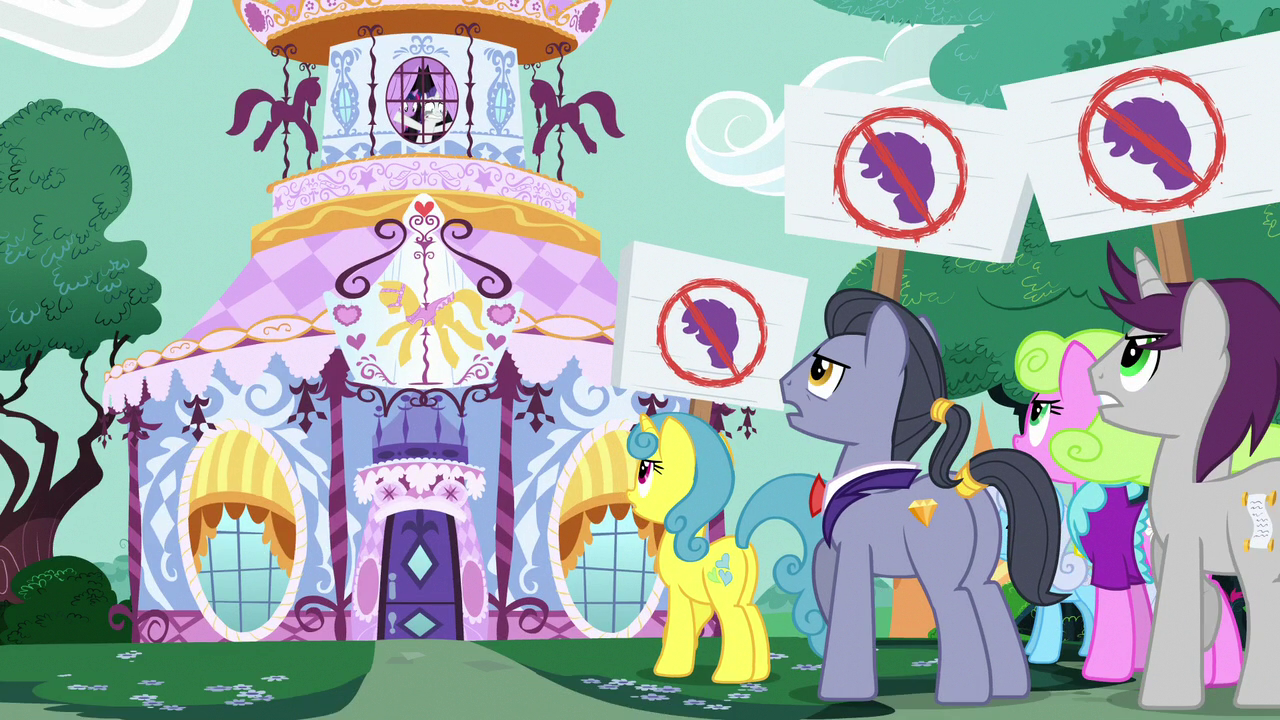 While walking through town, Twilight and Starlight meet a group of fanatical ponies from Fillydelphia who ask Twilight to autograph their journal copies. When Twilight asks what their favorite lesson was, the ponies admit they haven't actually read the journal and plan to keep their copies as mere collector's items. Elsewhere in town, two ponies sitting at a cafe table comment on the journal's illumination into the Mane Six's lives but also remark that they wish Rarity's sections were excluded. Rarity, sitting just a few feet away from them, is heartbroken and runs off in tears.