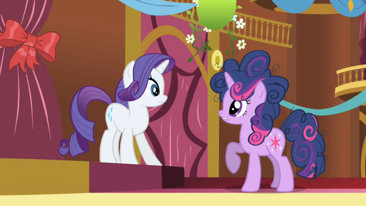 Twilight and Spike visit Rarity as she decorates the town hall for the festival. Spike is instantly smitten with Rarity who, shocked by Twilight's messy mane, brings her to Carousel Boutique for a makeover. Rarity is impressed when Twilight mentions that she is from Canterlot and remarks how they will become "the best of friends". Eager to get away from the fashionista, Twilight and Spike run out of the boutique while she is occupied.