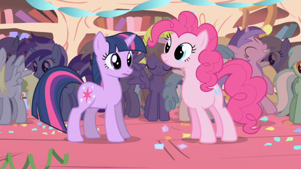 Twilight and Spike reach the library in the evening only to be greeted inside with a surprise party. Pinkie Pie, the pony they first encountered upon arriving in Ponyville, explains to a dismayed Twilight how she was surprised to see a new pony in town and decided to throw her a party so she would have "lots and lots of friends". Distracted by Pinkie's explanation, Twilight accidentally drinks hot sauce and runs up to her bedroom on the second floor. As she complains aloud that "making friends" has left her no time to read about the Elements of Harmony, Spike enters to report that sunrise is approaching.