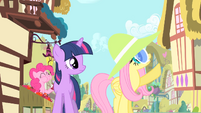 Twilight concerned, while Pinkie seems amused.