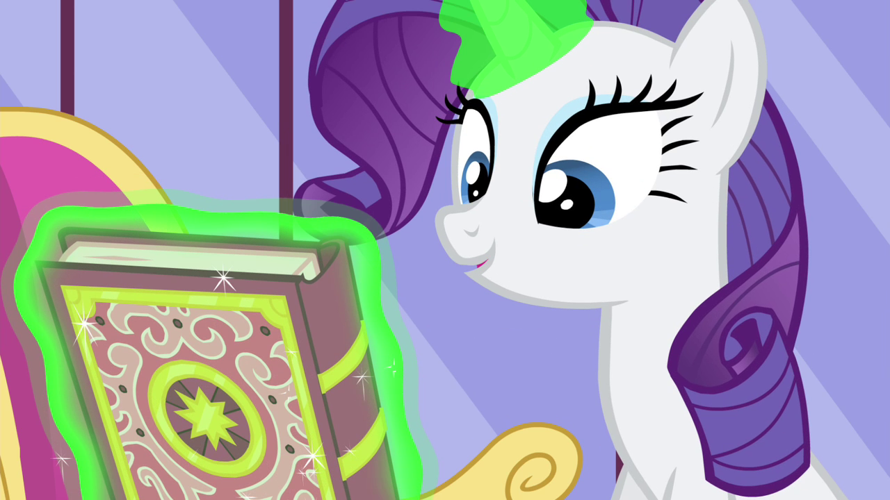 Spike returns to Rarity, who's now gone through several cartons of ice cream, and shows her what he found. Rarity brings herself out of her despair to try the spell: