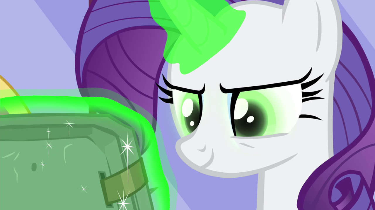 Unable to bring himself to divulge Rarity's secret, Spike determines that the next best way to stop Rarity is to get the spell book away from her so she can't harness its magic. He follows Rarity's path of creative destruction and finds her on the outskirts of Ponyville. While Owlowiscious distracts Rarity, Spike snatches the spell book from her and sneaks away. Rarity catches Spike, so he hides the book in his mouth and swallows it down whole.