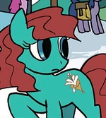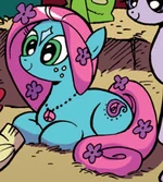 One of several foals who join the Cutie Mark Crusaders in picking up litter in White Tail Woods in My Little Pony: Spirit of the Forest Issue #1. She is a character named "Eco-conscious Schoolpony" in Gameloft's mobile game. Her bio states "Don't leave her holding the bag...unless it's a recycling bag!" Her cutie mark is a flower. |