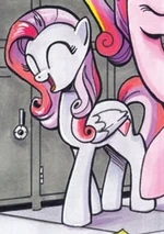 One of several foals who join the Cutie Mark Crusaders in picking up litter in White Tail Woods in My Little Pony: Spirit of the Forest Issue #1. She is a character named "Observant Schoolpony" in Gameloft's mobile game. Her bio states "Can spot carelessly thrown litter from VERY far away!" Her cutie mark is a winged heart. |