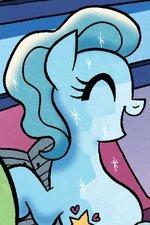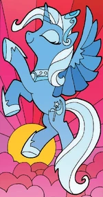 An alternate universe counterpart of Trixie, depicted in stained glass. She is a character named "Humble Trixie" in Gameloft's mobile game, and serves as a boss battle helper for the "Reflections: Battle for the Moon" event. Her bio states, "This paragon of humility ends each show with an extended shout-out to all her artististic and magical collaborators. It's a very long list!" |