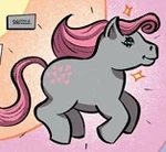 Appears during the scavenger hunt in My Little Pony: Friends Forever Issue #16. Resembles Bubbles of the Powerpuff Girls, who is named the same as a G1 Earth pony and as one of multiple crew names for Derpy. |
