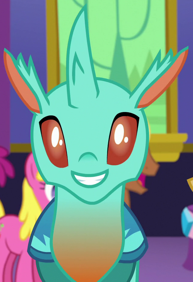 Appears in Celestial Advice during the party for Starlight Glimmer, Trixie, Discord, and Thorax. Design reused from S06E26 Unnamed Changeling #5. Voiced (uncredited). |