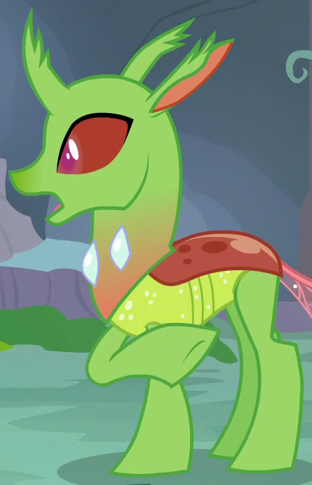 Appears disguised as Twilight Sparkle in To Where and Back Again - Part 1. Design reused from original changeling design. Voiced by Ian Hanlin. |