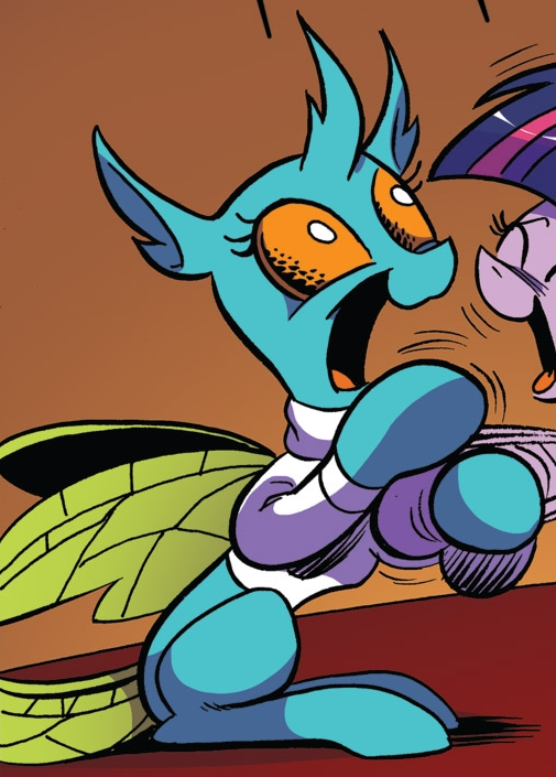 Appears in My Little Pony: Friendship is Magic Issue #61 and Issue #62 as the official changeling archivist at the Convocation of Creatures. She is a character in Gameloft's mobile game, and serves as a boss battle helper for the "Convocation of the Creatures!" event. She also serves as an enemy minion with a story role during the "Welcome Back Twilight" event, in which she is invited to teach at the School for Gifted Unicorns. Her bio states, "The bubbliest changeling librarian you'll ever see -- and quite possibly the only one!" |