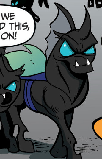 Appears on My Little Pony: Friendship is Magic Issue #4 page 9 as one of Queen Chrysalis' more muscular changeling drones. He is a character named "Bulky Changeling" in Gameloft's mobile game. His bio states "Is he REALLY super ripped, or did he just shapeshift into a Changeling who LOOKS super ripped? Who knows!" |