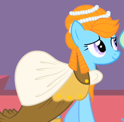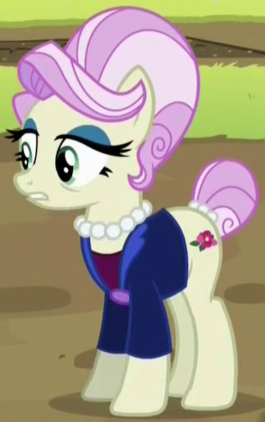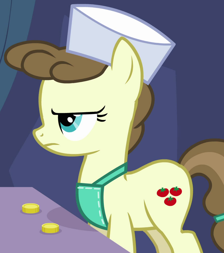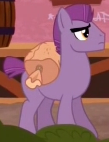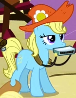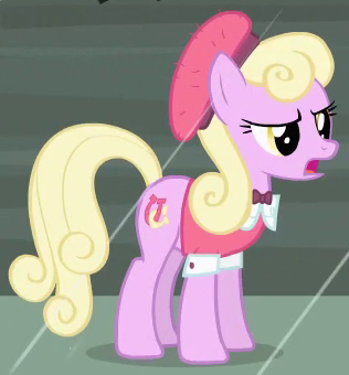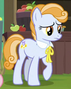 A Whinnyapolis tourist and Chargrill Breadwinner's wife in Spice Up Your Life. Also appears in Viva Las Pegasus, Once Upon a Zeppelin, and Grannies Gone Wild. Her cutie mark is an orange slice. Voiced by Enid-Raye Adams. |
