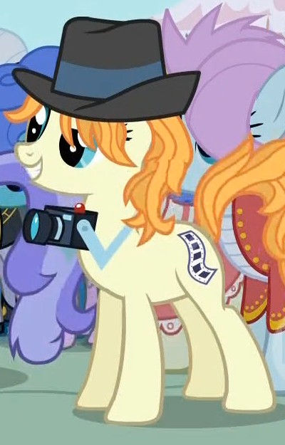 hsl(35, 66%, 70%)¤ | hsl(49, 64%, 69%)¤ | hsl(205, 59%, 56%)¤ | Appears in My Little Pony Micro-Series Issue #2 and its adaptation Rainbow Sonic[specify] as a reporter for PNN (see also 'Al Roker'), covering "Cloudgate". Also appears in Friends Forever Issue #7, Issue #9, and Issue #33. Created and scripted as "Redford Pony" by Ryan K. Lindsay ("Oh, and then there’s the pony I’ve simply credited in my script as Redford Pony, I’m pretty happy with how he’s come out."/"I've also created my own pony which I called, in the script only, Redford Pony. I think he's pretty rad."); resembles Robert Redford as All the President's Men (film) Watergate scandal reporter Bob Woodward. His cutie mark is the acronym PNN. |