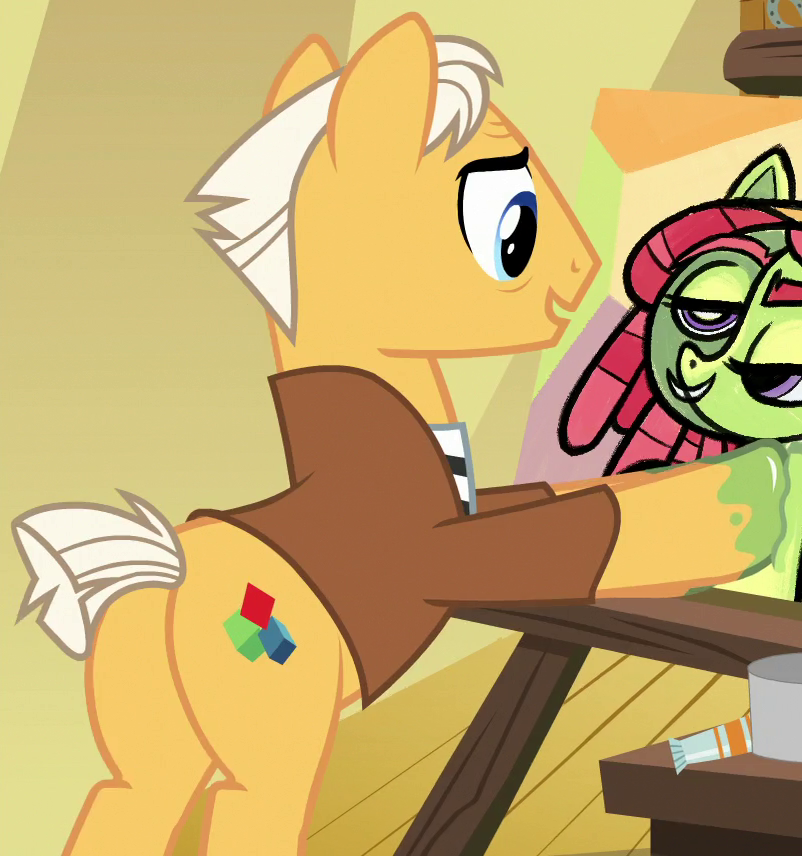 Appears in Grannies Gone Wild at Flim and Flam's Las Pegasus resort. He is a character (with an altered design) named "Mad Scientist Pony" in Gameloft's mobile game. His bio states "Once turned himself into a marinated asparagus as part of a magical experiment. It was a whole thing." Resembles Rick Sanchez from Rick and Morty. His cutie mark is a glass beaker. |