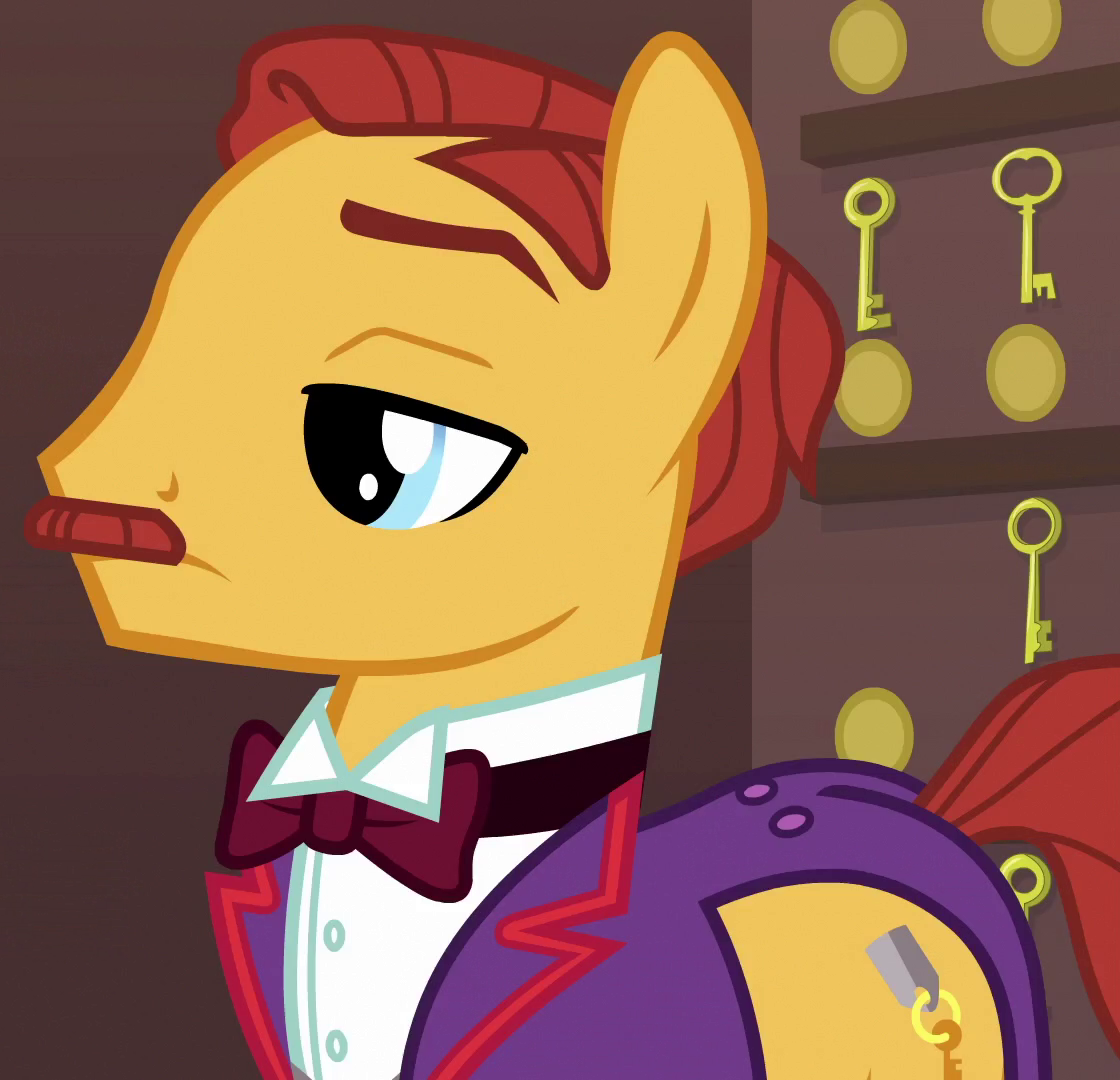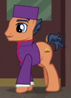 Appears in Road to Friendship as an innkeeper in Somnambula. Shares his body type and eye color with "Turner McColt", Dandy Grandeur, "Snow Hope", and BGE Unnamed Earth Stallion #2 and his body type with Cheese Sandwich, "Mules Grassfield", and Mudbriar. He is a character named "Tall Innkeeper" in Gameloft's mobile game. His bio states, "His height makes it easier for him to see all the ponies waiting in line to book a room. It's usually a lot!" Voiced by Kathleen Barr. |