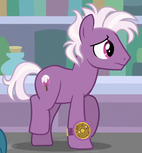 Appears in The Last Problem in future Ponyville. Shares his design and eye color with S08E14 Unnamed Earth Stallion #1 and his design with S07E22 Unnamed Earth Stallion #2. His cutie mark appears to be two lollipops. |
