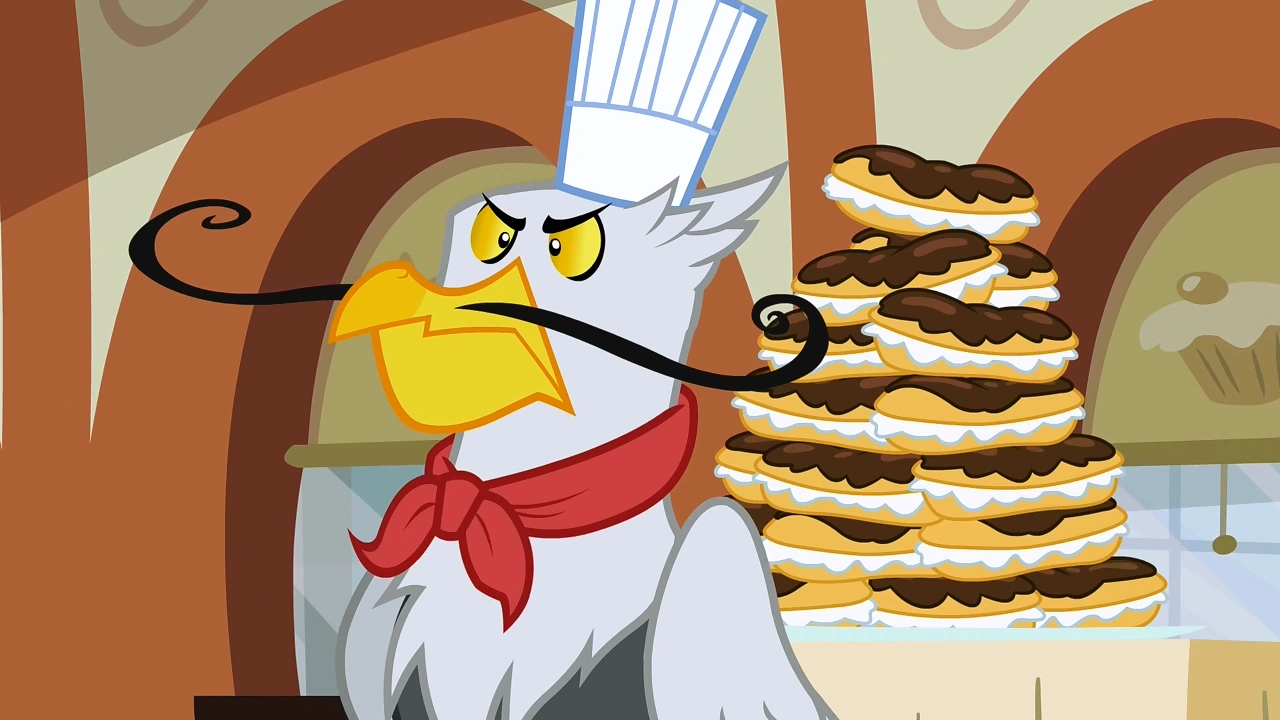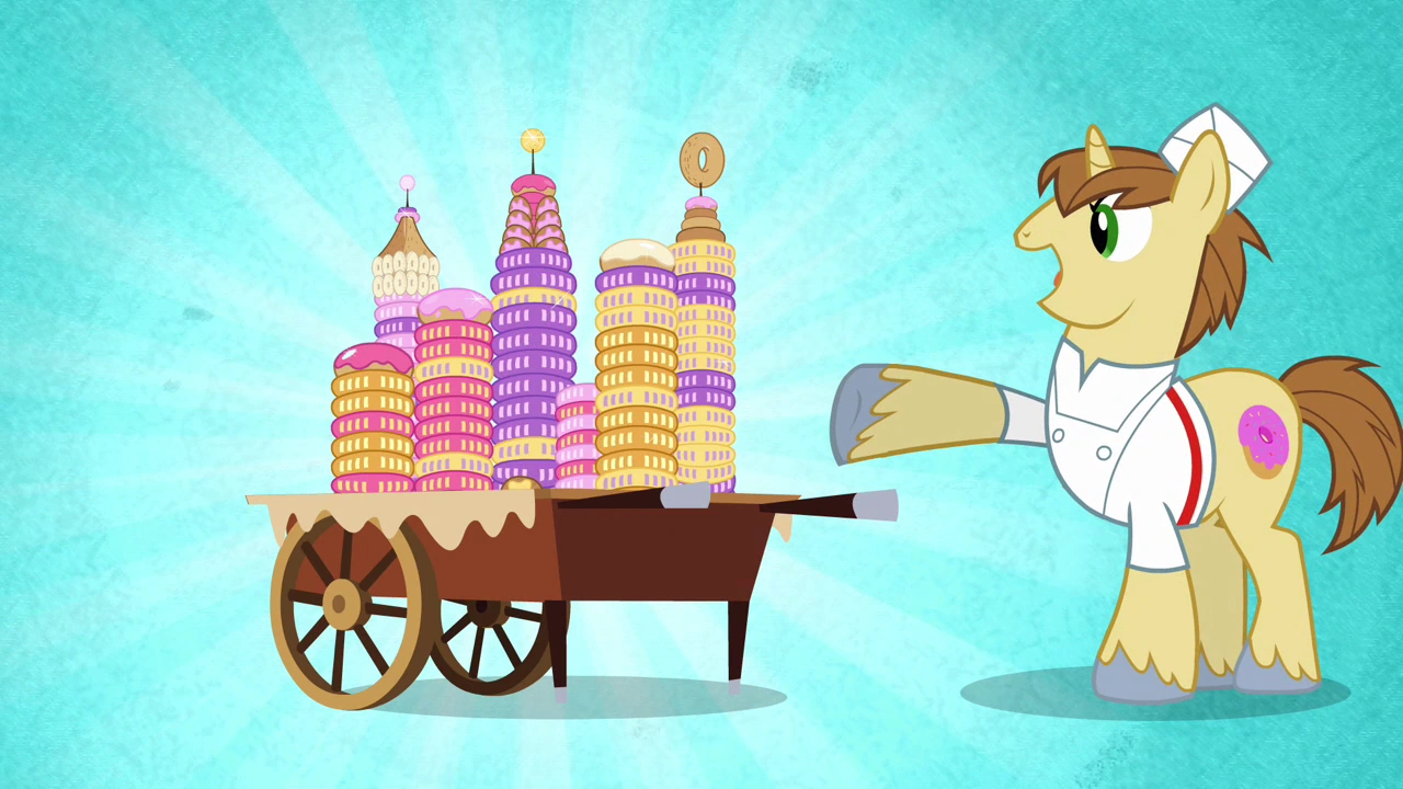 Just then, three other National Dessert Competition participants board the train. Gustave le Grand, a pompous griffon with a French accent, declares that his Exquisite Éclairs will win first prize. Donut Joe, the unicorn stallion with a Brooklyn accent that operates Twilight and Spike's favorite donut shop in Canterlot, carts in his "Donutopia", a small city model made out of sprinkled donuts. Lastly arrives Mulia Mild, a mule with a large chocolate mousse moose, and brags how winning will make her the greatest chef in Equestria. The four entrants argue amongst themselves as the train starts moving. Twilight then recommends that everyone gets rest, and Gustave, Joe, and Mulia head to their compartments. The ponies head to their own compartments only to be stopped by Pinkie, who states that the group needs to guard "MMMM" from the other chefs and potential saboteurs. Believing that Pinkie Pie is overreacting, Twilight and the others retire to their compartments. Pinkie Pie, however, decides to spend the night guarding the "MMMM".