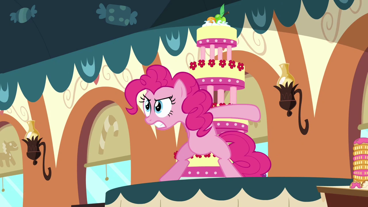 Pinkie and the group head up to the competition with their newly made dessert—a combination of all the bakers' confections—and conclude that you mustn't accuse others of a wrongdoing without any proof, as it can hurt their feelings and make them look silly. They celebrate their success and teamwork with Princess Celestia and a piece of cake, which Pinkie turns down only to devour the rest of the entire cake, leaving her incredibly bloated before she eats the fourth wall.