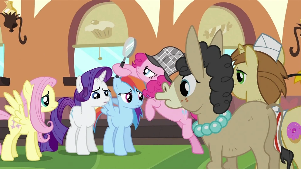 With the mystery of the cake solved, Twilight gives the deerstalker to Pinkie, who uses what she's learned to look for the clues to solve the mystery of who devoured the other bakers' desserts. Pinkie soon reveals that the bakers all have traces of another baker's confections on them, and deduces that they ate each other's desserts: Joe has éclair in his hair, Gustave has mousse in his mustache, and Mulia has sprinkles in her wrinkles. The bakers confess to the crimes, stating (once again) that Pinkie's earlier description of the desserts enticed each one into eating them. Equally guilty, the bakers all forgive each other. The train reaches Canterlot with all the desserts destroyed. However, Pinkie has an idea of how they can all enter with their goods.