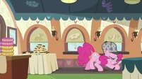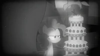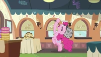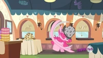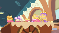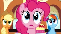Pinkie looking at the MMMM cake.