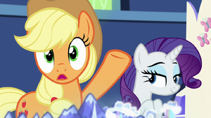 Rarity is excited when the map appears to call her and Applejack to a particular neighborhood in Manehattan. Applejack, however, is confused about why the map would summon her—a simple country pony—to such a large city, but Twilight is certain that the map chose her for a reason. Despite having to miss the upcoming Sisterhooves Social, Applejack and Rarity set out.