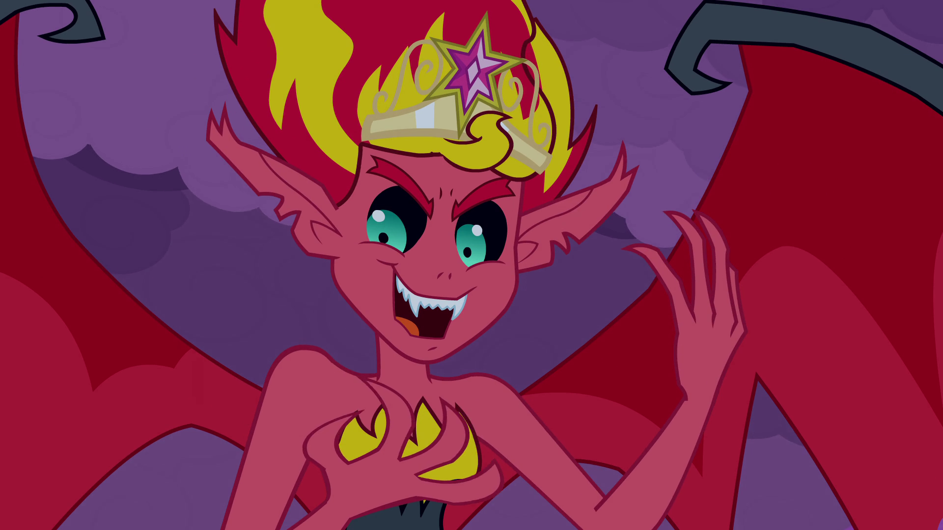 A giddy Sunset immediately places the crown on her head. As soon as she does this, a magical aura surrounds her and she is lifted up into the air. Twilight, her friends, and onlooking Fall Formal attendees watch in horror as Sunset is surrounded by a dark aura and transformed into a demonic creature, with red skin, fiery hair, wings, and a tail. Using her magic, Sunset proceeds to turn Snips and Snails into demons similar in appearance. The students retreat to the supposed safety of the school doors, but the transformed Sunset tears away the entire front entrance, declaring herself the students' "princess" and demanding their loyalty. She flies into the school and projects her magic onto the fleeing students, hypnotizing them into submission.
