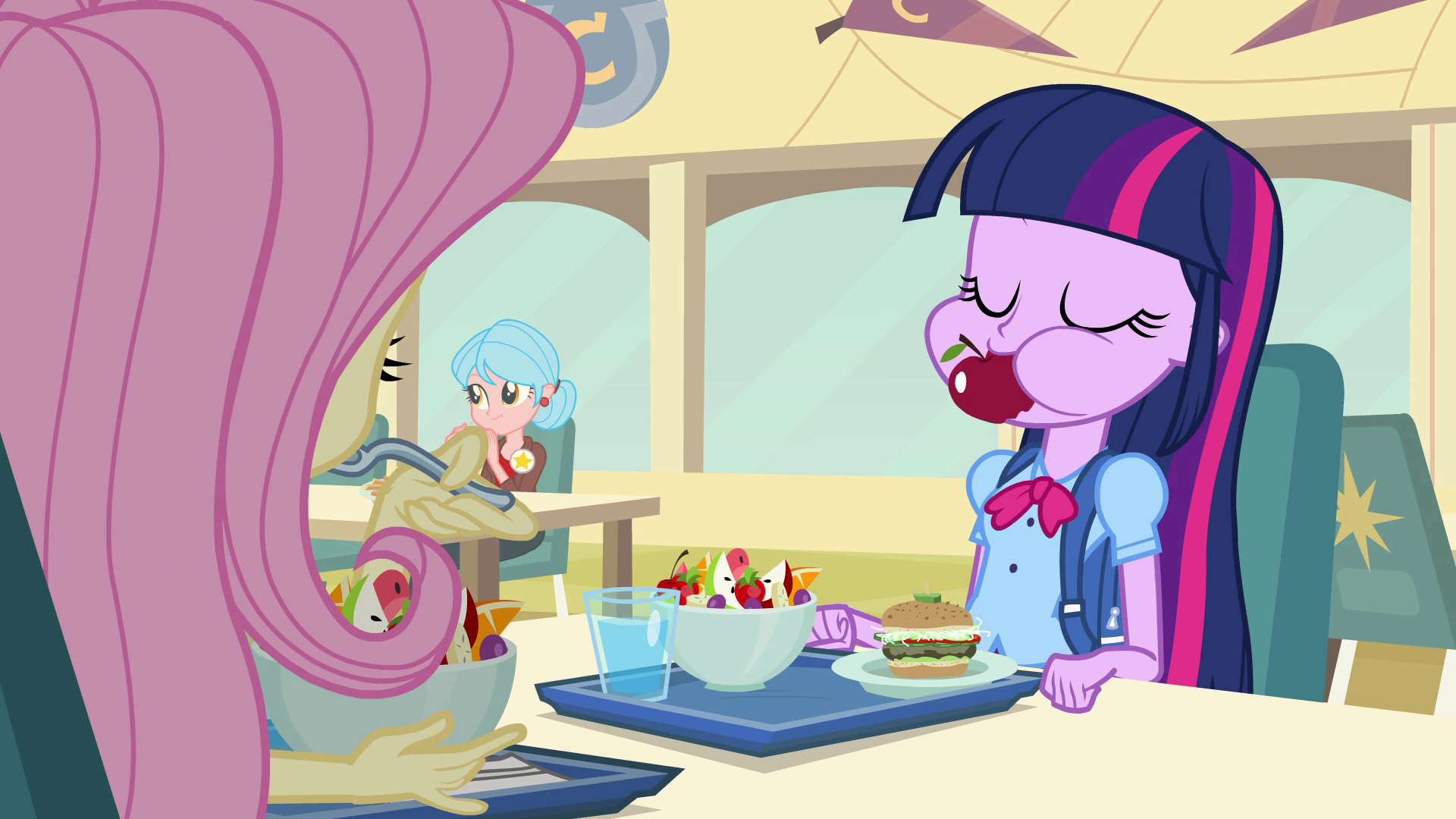 At lunch, Twilight meets Fluttershy again in the cafeteria and shares with her decision to run for Princess of the Fall Formal. This news comes as a shock to Fluttershy, who warns Twilight that Sunset makes life miserable for those who oppose her. It's here that Twilight also learns about how isolated all the social groups of the school are from one another, from the athletes to the fashionistas to the rockers, and that she'd have to get all of them to vote for her. Twilight is still determined however, and asks where to find the head of the Fall Formal planning committee.