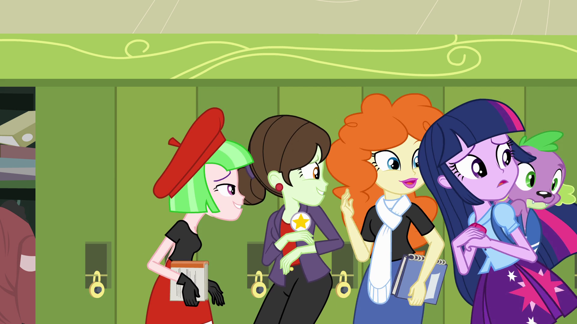 Sunset confronts Twilight in a barely lit, dead end hallway and gives her a verbal lashing, scoffing at her efforts to run for Princess of the Fall Formal, outright insulting and belittling her, and even threatening Spike's safety.