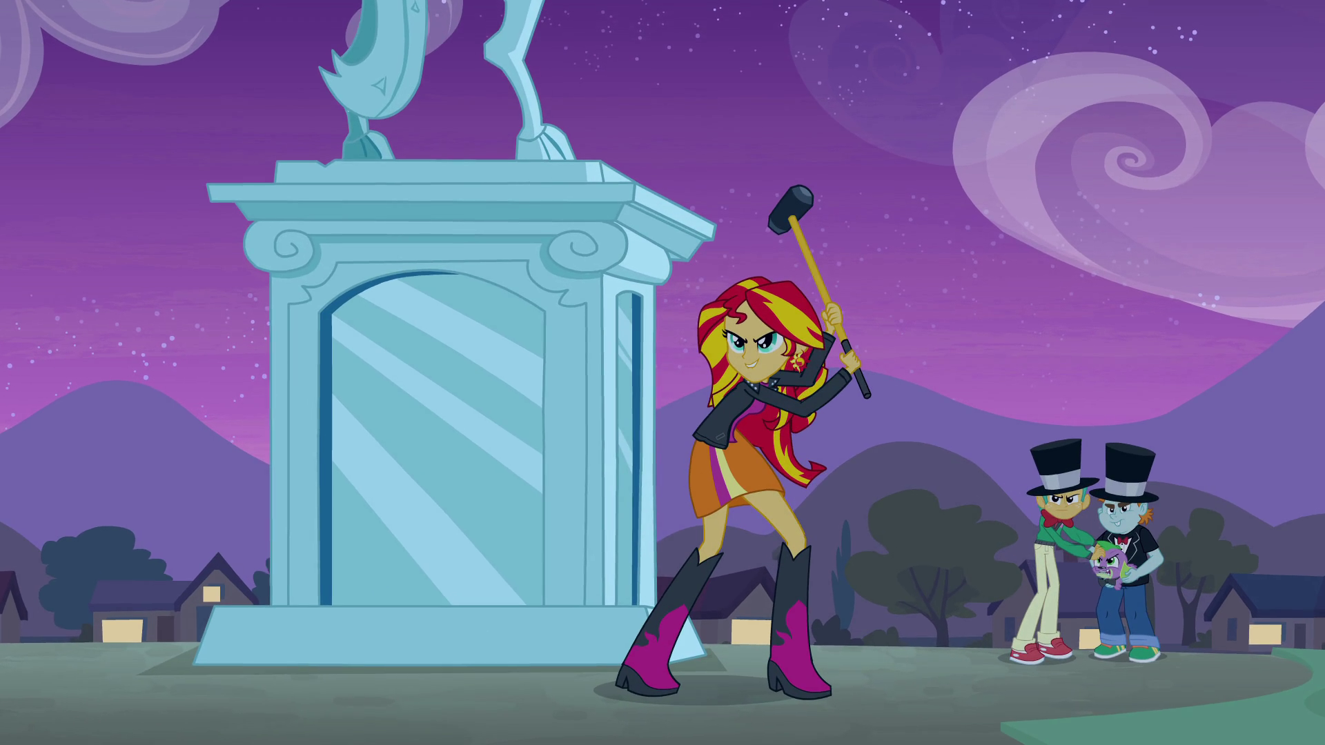 Twilight and her friends find themselves face-to-face with Sunset Shimmer, brandishing a sledgehammer and ready to destroy the portal back to Equestria. Twilight tells Sunset not to hurt Spike; Sunset, saying she "wouldn't dream of it", tells Snips and Snails to let Spike go. Sunset then gives Twilight an ultimatum: give the crown back and be allowed to return to Equestria, or keep the crown and never go back. Twilight, maintaining her fortitude, keeps the crown. Surprised by this, Sunset tries to reason with Twilight to hand over the crown, to which Twilight replies by explaining she's seen what Sunset has been able to do to Canterlot High even without the magic the crown will give her.