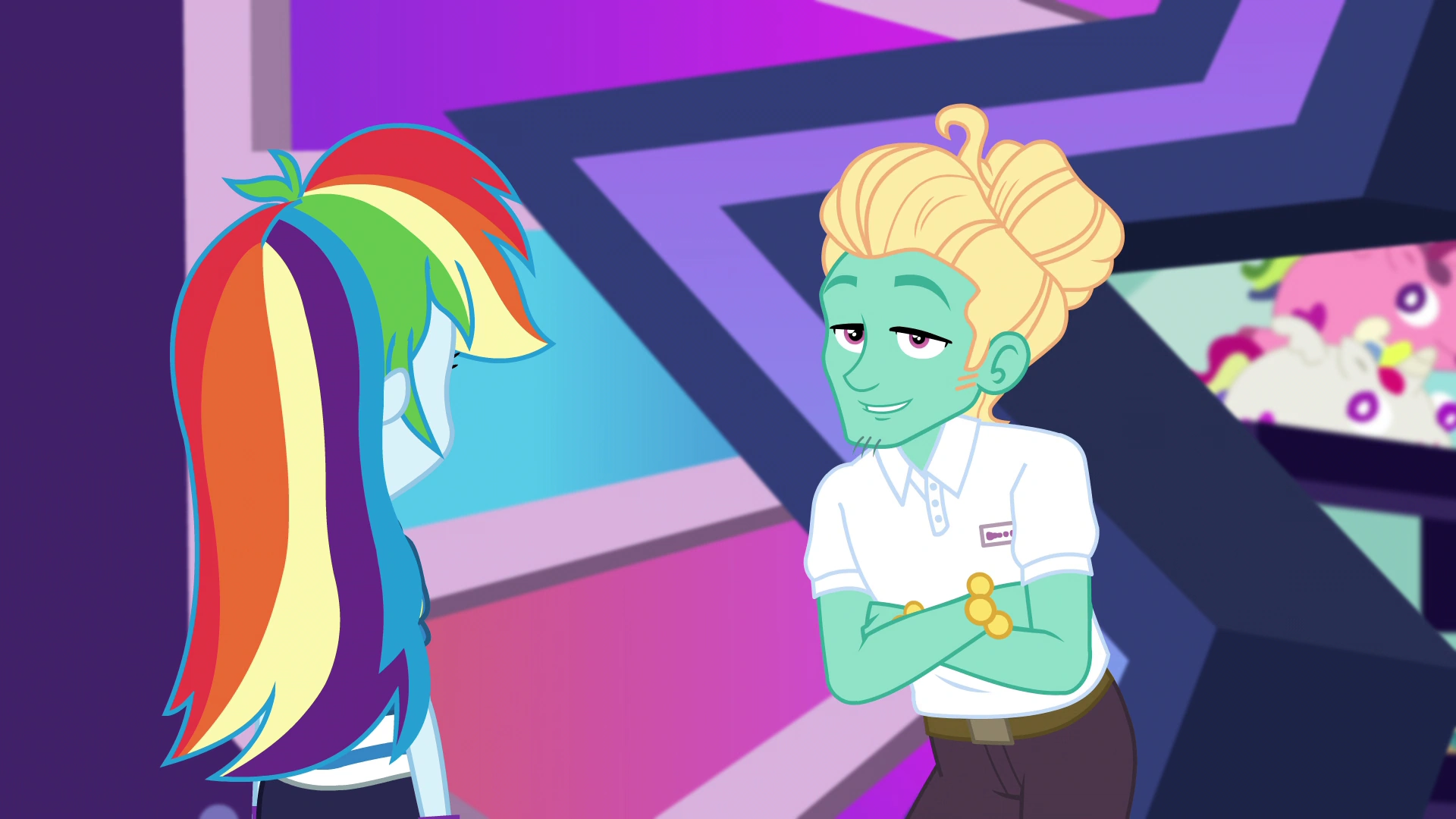 Zephyr shows Rainbow a multitude of store items—clothes, fidget spinners, sporting goods, virtual reality goggles, extendable high-five arms, etc.—but Rainbow does not consider anything he shows her to be suitable for Fluttershy's tastes. He eventually suggests an instant camera to replace Fluttershy's camera that broke the previous year. Rainbow Dash approves of the camera, buys it from Zephyr, and thanks him for his help.
