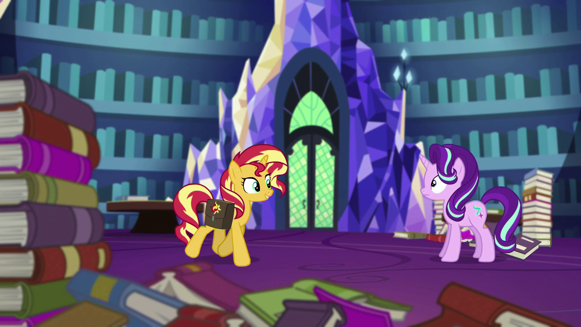 Outside Canterlot High School, Sunset goes through the portal under the Wondercolt statue base and transports back to Equestria. In her old unicorn form, she crashes into the Castle of Friendship library and runs into a pony whom she believes to be Twilight at first. However, the pony introduces herself as Starlight Glimmer, Twilight's student. After Sunset gets reaccustomed to her pony form, Starlight gives her a new journal to replace her old one. Unfortunately for Sunset, Twilight is currently away on a friendship mission.