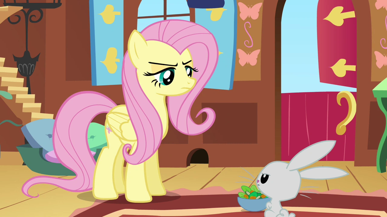 At her cottage, Fluttershy apologizes to Angel for the lack of cherry and tries to serve the salad without it, leading the bunny to kick her straight into her outdoor mailbox. Landing on the ground just outside her door, Fluttershy acknowledges being a "doormat" before noticing a flier on her head advertising an assertiveness seminar. After a moment of consideration, she pulls herself up and vows: