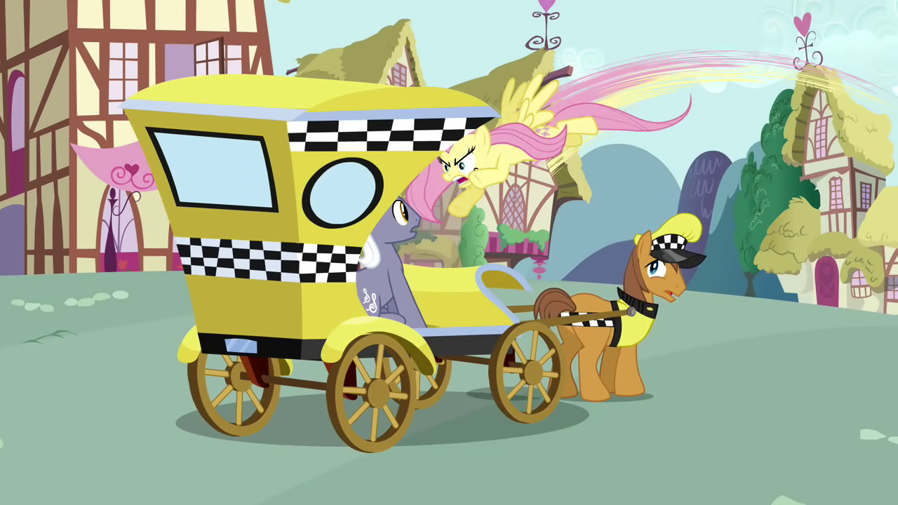 Sometime later, Fluttershy exits her cottage ready to "attack the day". She finds Mr. Greenhooves over-watering her flowers in the front yard, but when he causally dismisses her concerns, Fluttershy causes a buildup in his hose that ends up drenching him, causing him to relent. Down the road, Fluttershy encounters Cherry Berry and Sweetie Drops blocking a bridge pass with their garbage carts as they chat in place. The pair brush off her initial requests to move but soon acquiesce when Fluttershy kicks the carts' contents onto their heads.