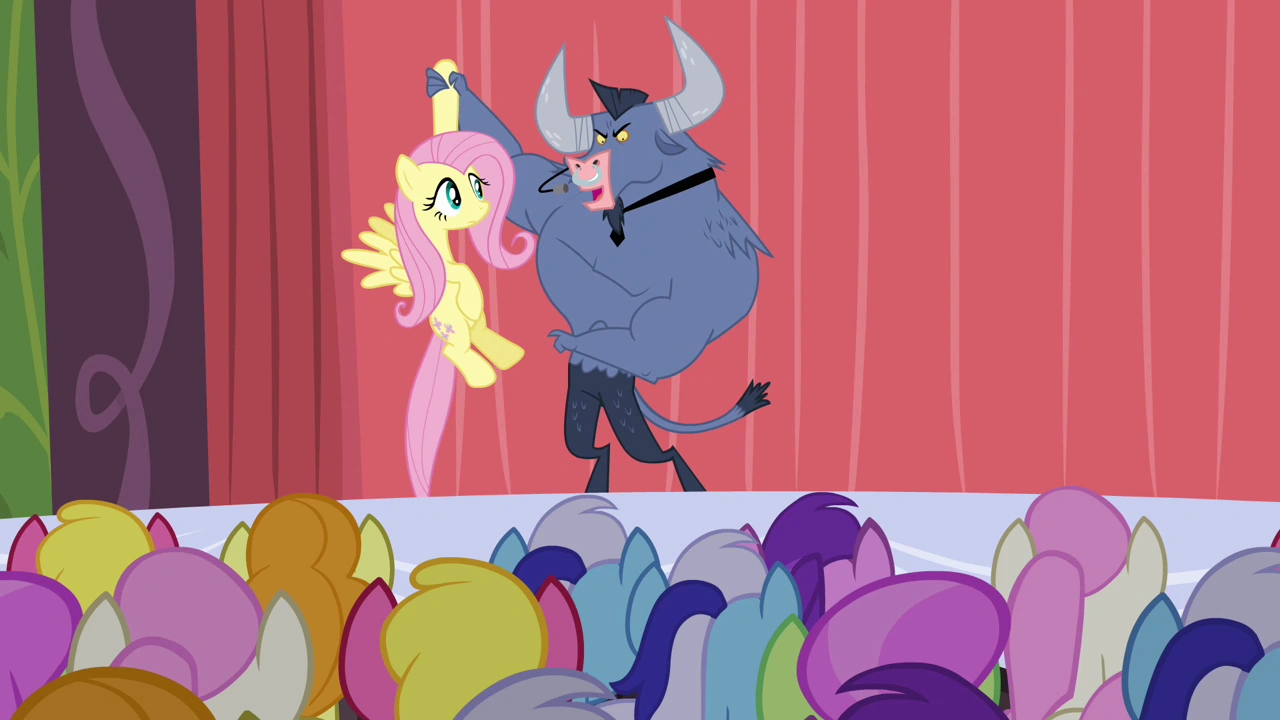 Fluttershy arrives at the seminar and joins a crowd of ponies as they watch a minotaur named Iron Will appear on a stage amidst fireworks and dramatic music. After promising a full money-back satisfaction guarantee on his techniques, Iron Will calls for a volunteer from the audience. His goat assistants end up picking Fluttershy, though as she tries to walk on stage, another assistant blocks her path. When she fails to come up with a way to deal with the obstruction, Iron Will instructs her to be aggressive and unapologetic. Fluttershy manages a stern rebuke against the assistant, which Iron Will promotes as proof of the efficacy of his techniques to the cheering crowd.