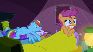 When night falls, the ponies gather around the campfire as Rainbow tells a scary story about the Olden Pony, which ends up frightening the fillies. Scootaloo manages to convince Rainbow that she wasn't scared by the story, but when everyone retires to bed, she has a nightmare about the Olden Pony chasing her around the forest. The dream wakes Scootaloo in the middle of the night and, too afraid to fall back asleep, she remains awake until morning.