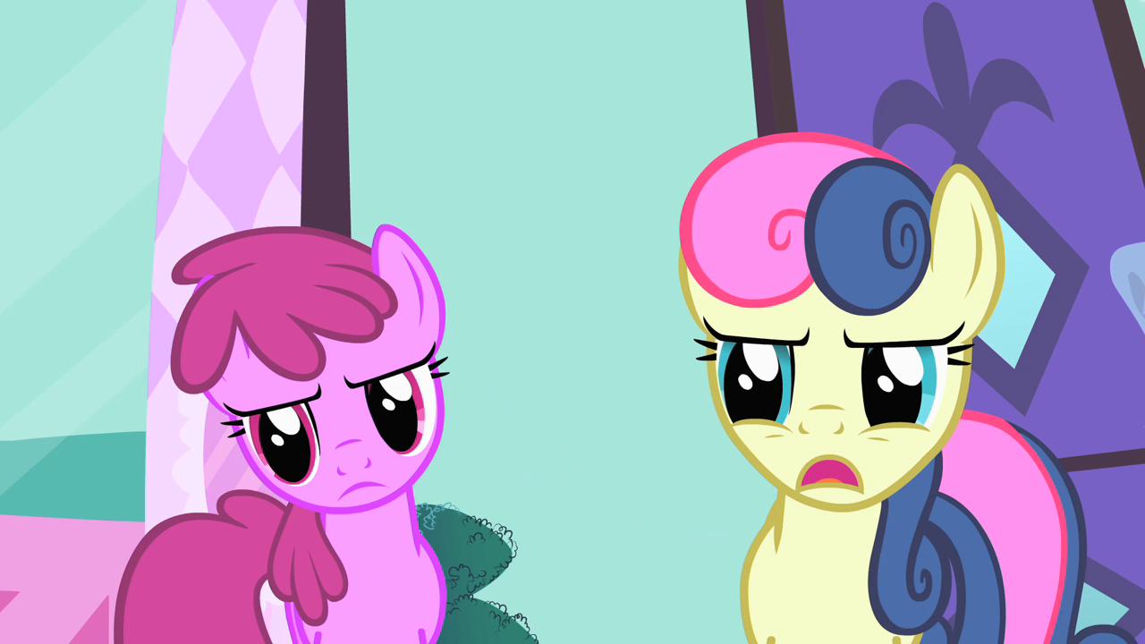 In Marks for Effort, Cozy Glow helps Sweetie Drops (referred to as Bon Bon by Scootaloo) protect her face from the spines of a cactus she just bought by means of Scootaloo's helmet. Here, she has another speaking role.