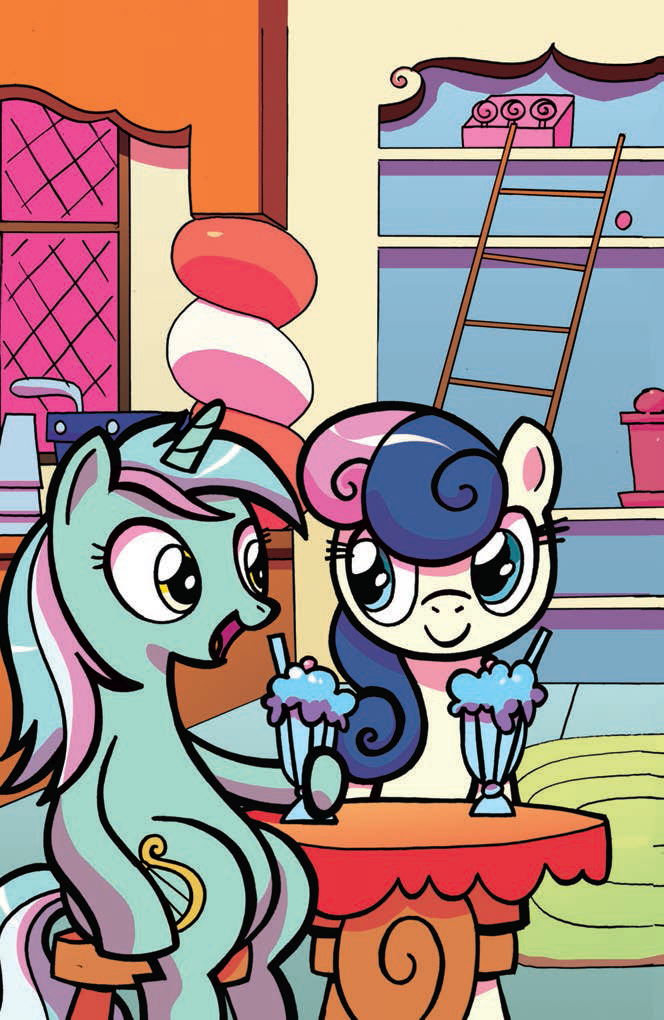 In Slice of Life, she and Lyra help decorate Town Hall for Cranky Doodle Donkey and Matilda's wedding. It is revealed that Sweetie Drops is a former agent working for a monster-hunting agency out of Canterlot, but the agency was dissolved when a bugbear escaped from Tartarus. As the one who had originally captured it, Sweetie Drops went undercover in Ponyville using the alias "Bon Bon" to leave her old life behind. This revelation deeply upsets Lyra, her best friend, but the two later make amends when Lyra shares one of her own secrets.
