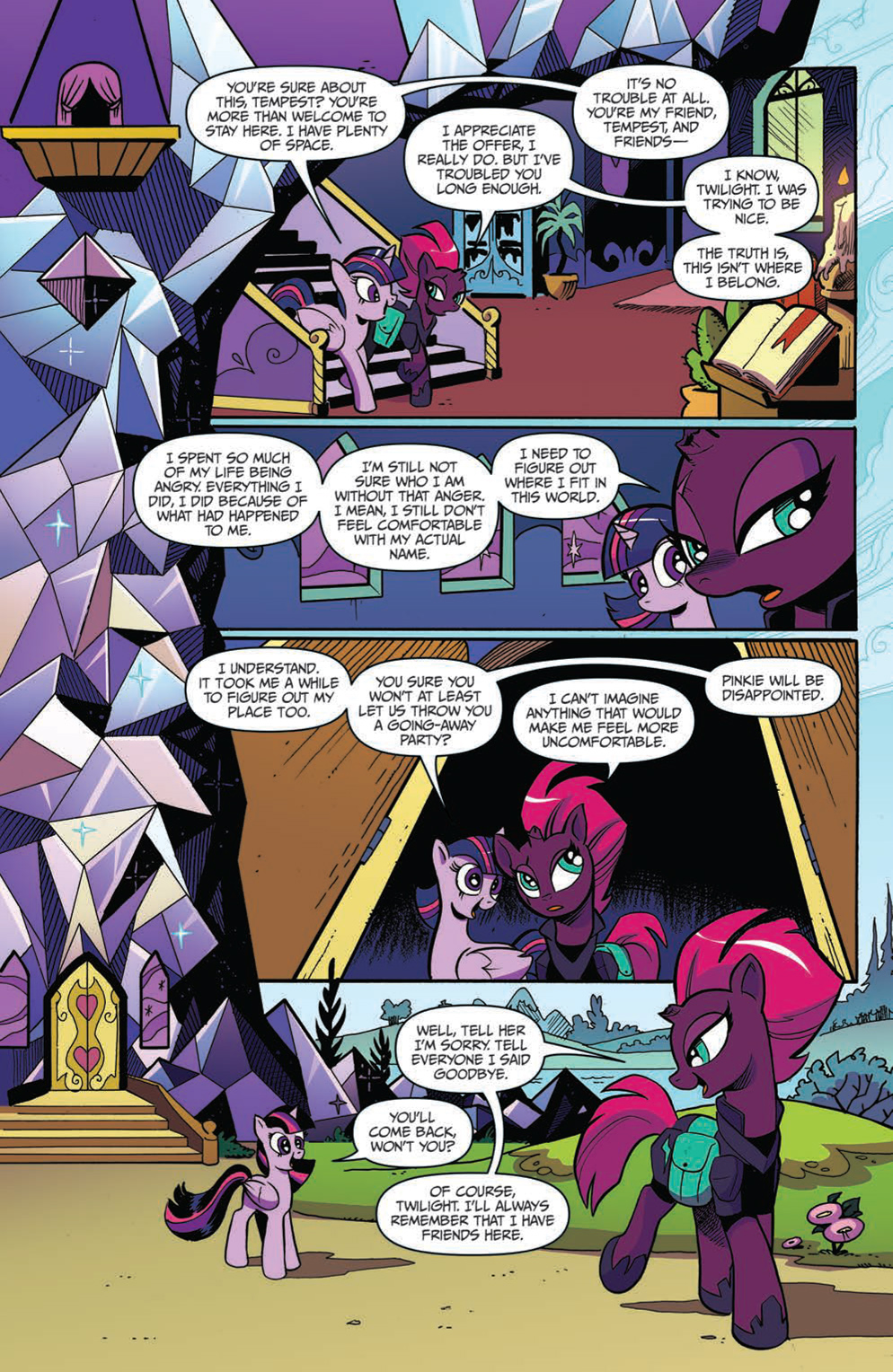 In Tempest's Tale, she is shown to feel out of place in Ponyville (due to how "sunny" it is there), and helps others during her travels in order to atone for her past misdeeds. She is quite blunt and cynical, openly telling Princess Cadance to her face that she believes she represents everything that is wrong with Equestria. She also shows resentment and bitterness toward Glitter Drops for the events of their youth, becoming outraged when Glitter Drops saves her from an ursa minor. After Glitter Drops admits how guilty she feels about what happened and shows her skills while tracking the Ursa Major, Tempest realizes she misjudged her old friend and reconciles with her, even allowing her to call Tempest by her childhood nickname "Fizzy".