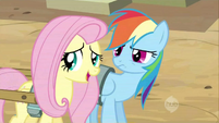 Twilight and Fluttershy surprised at Rainbow's quick departure. Never let her loose or you'll regret it.