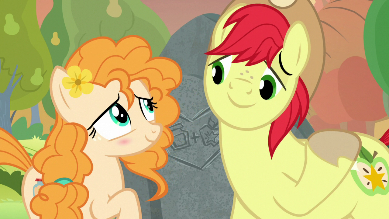 Despite this, the two continue to see each other in secret. On the anniversary of when they first met, Pear Butter sings a soft love ballad on guitar for Bright Mac, and Bright Mac leads her to a spot where he carved their cutie marks into a rock, revealing their strong romantic feelings for one another. Unfortunately, some time later, Grand Pear tells Pear Butter that they're moving away to Vanhoover not only to expand their family's pear business but also to get away from the Apple family.