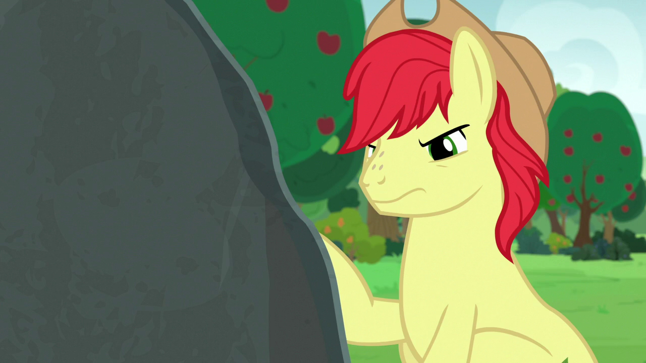The next morning, Applejack, Apple Bloom, and Big McIntosh travel to Goldie Delicious' cabin and ask her about the feud between the Apples and Pears. Goldie is nervous about going behind Granny Smith's back, but she decides to tell the Apple siblings the story.